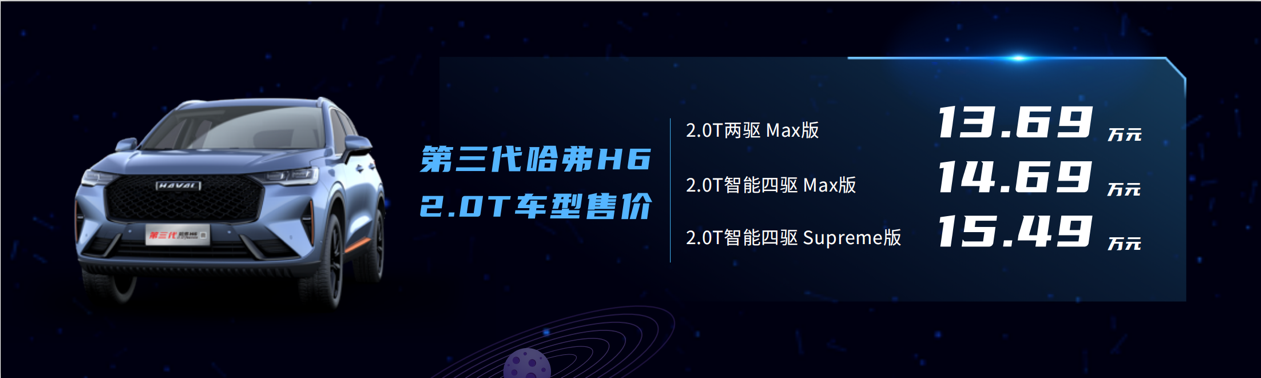 发布会上,黑科技星球首席营销官杨志明正式公布第三代哈弗H6 2.0T车型的售价,2.0T两驱Max版、2.0T智能四驱Max版、2.0T智能四驱Supereme版三大版本售价分别为13.69万元、14.69万元、15.49万元,以亲民定价让用户享受更智能、更酣畅的驾控体验。同时,车主代表还上台为广大车主争取到了最大福利,前10000名第三代哈弗H6 2.0T车主可享受6年12次免费基础保养的专属优惠政策。此外,第三代哈弗H6 2.0T车型还提供六大超神礼遇,包含36期0息或50%首款+尾款弹性贷的超值金融礼、至高6000元的超高置换礼、1000元车主精品大礼包的超足暖心礼,以及终身免费基础流量+3年娱乐和尊享服务的超额流量礼、免费FOTA升级的超前升级礼、首任车主发动机+变速器核心部件终身质保的超长质保礼,给消费者十足的诚意。