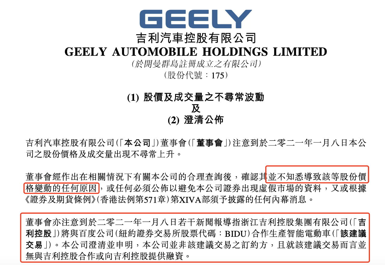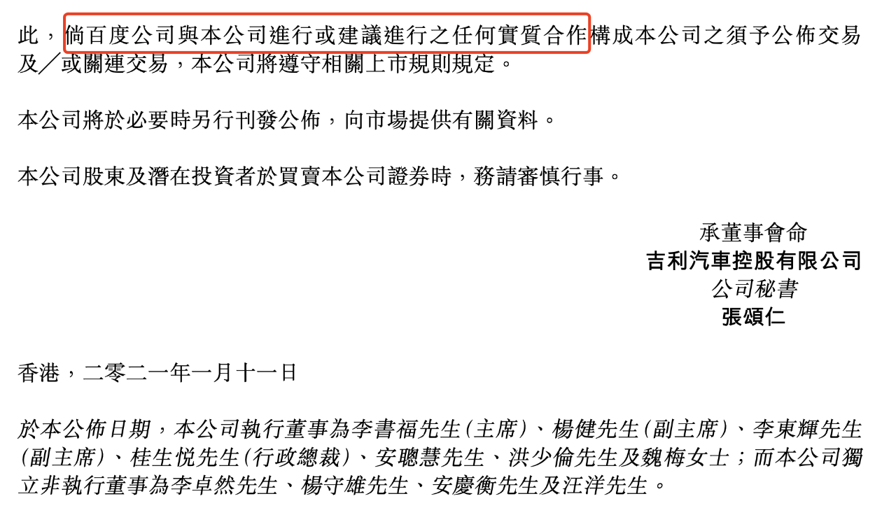 在百度造车官宣后,吉利汽车发布公告,“澄清并申明,本公司并非该建议交易之订约方,且就该建议交易而言并无与吉利控股合作或向吉利控股提供融资。倘该建议交易落实,……本公司并不排除寻求与百度公司潜在合作机会之可能性。”