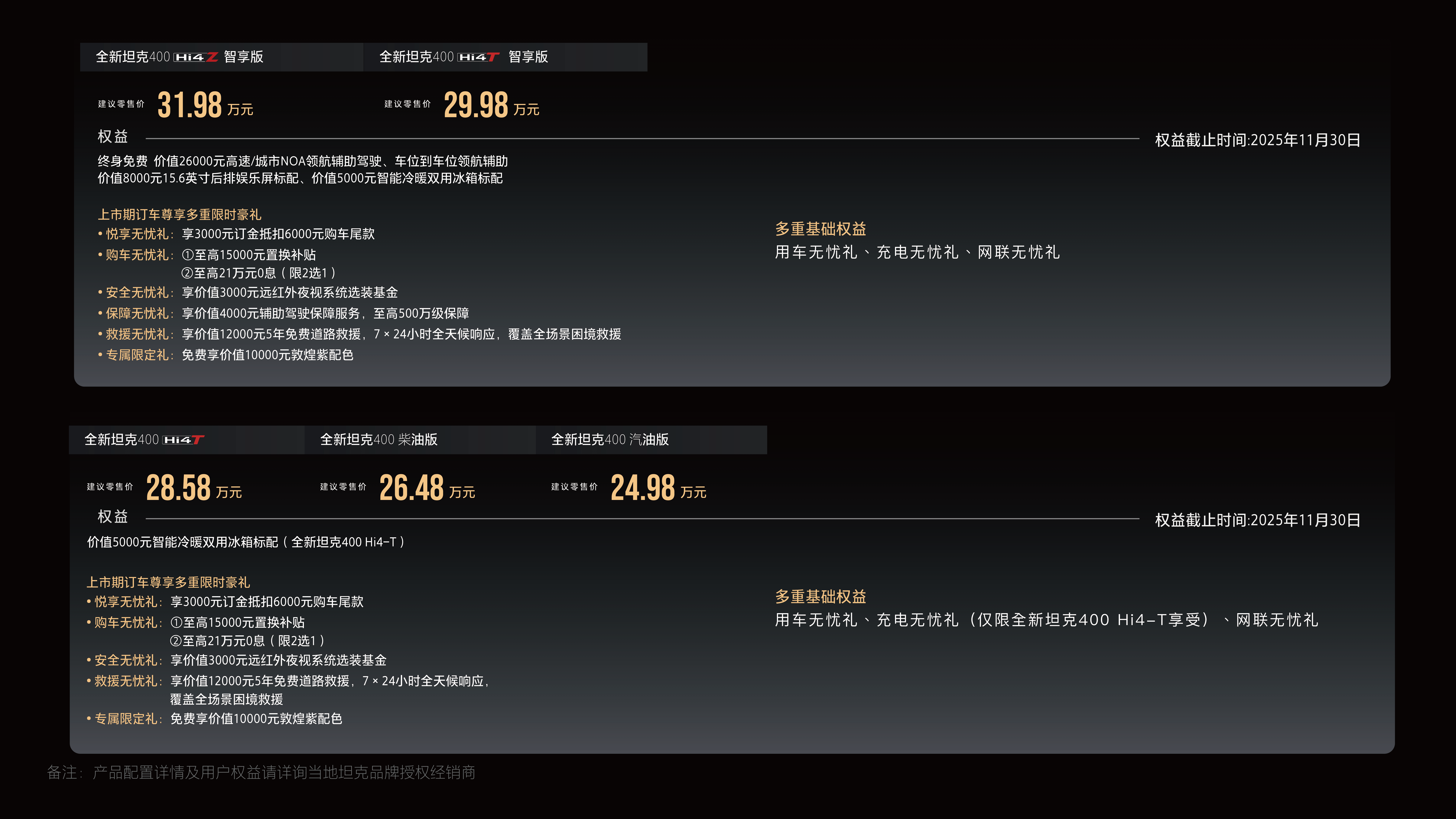 此次上市的全新坦克400共推出5款配置车型,具体售价如下:Hi4-Z智享版31.98万元、Hi4-T智享版29.98万元、Hi4-T 28.58万元、柴油版26.48万元、汽油版24.98万元。