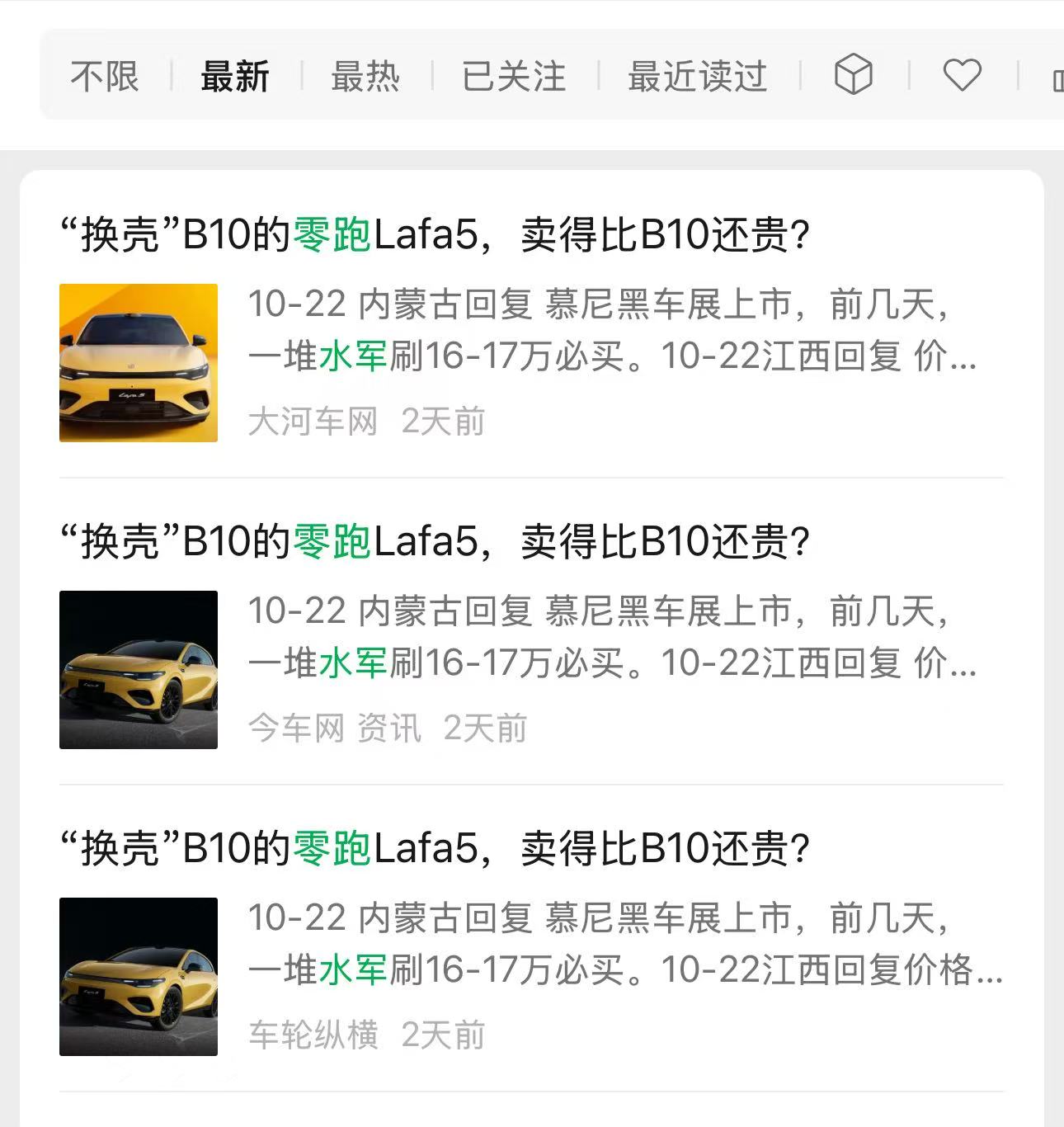 在销量势如破竹之际,也惹来了一些“不一样的声音”。11月7日,杭州。零跑全新个性战略新品——零跑Lafa5开启预售,预售价区间10.58-13.18万元。预售会之后,网上疑似出现水军攻击零跑汽车,一样的标题,一样的内容,说“零跑Lafa5的调子起得相当高”。