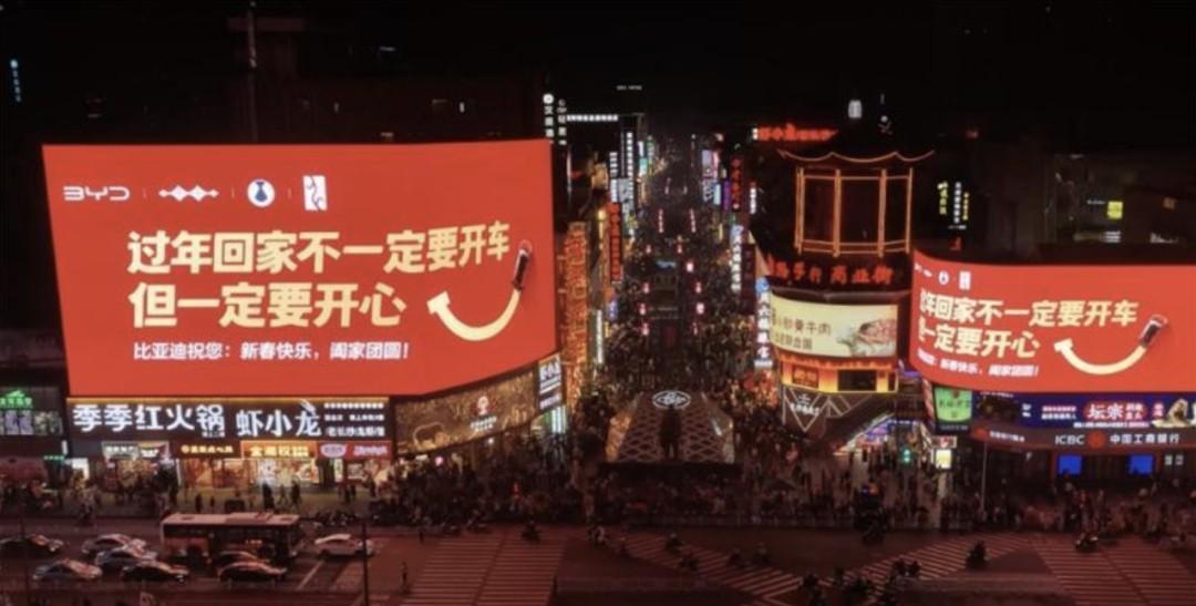 比亚迪在春节期间,于机场、高铁站、核心商圈投放“过年回家不一定要开车,但一定要开心”主题广告,倡导多元、轻松的过年方式。