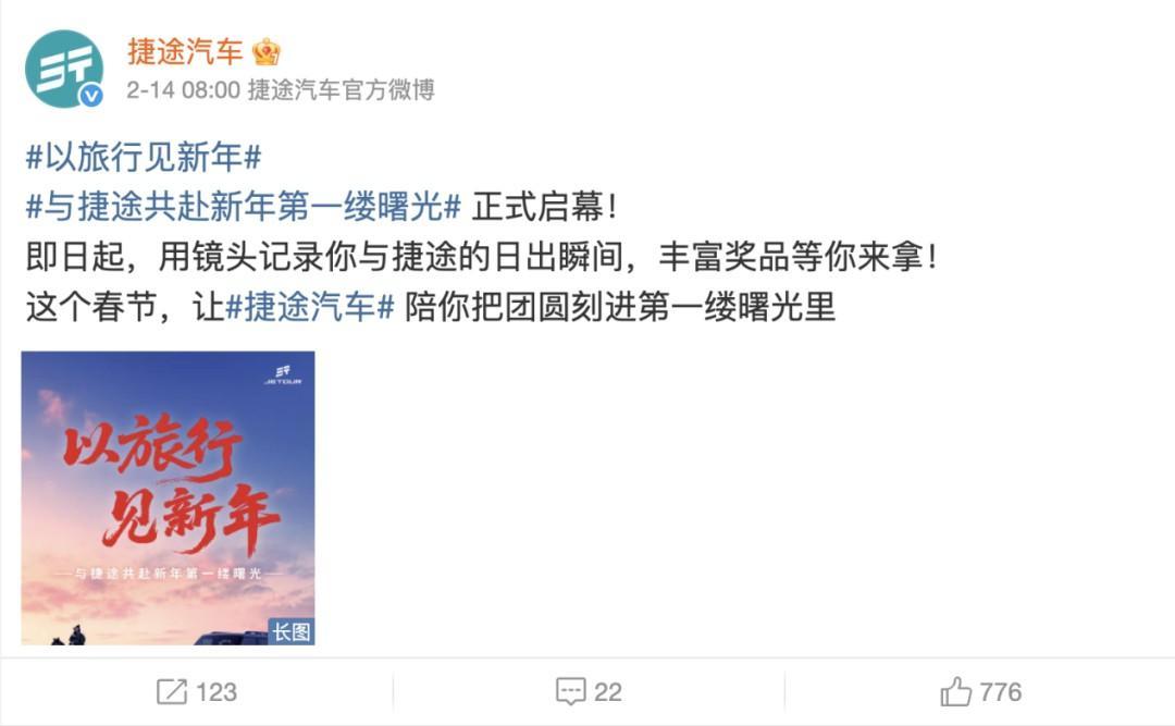 2月14日,捷途汽车则绑定民俗仪式,变“工具”为“生活方式”。它发起“与捷途共赴新年第一缕曙光”自驾活动,结合春节看日出的民俗,为用户规划多条自驾路线,联动全国多个景区、露营地提供专属福利,鼓励用户驾驶捷途车型迎接新年第一缕曙光。