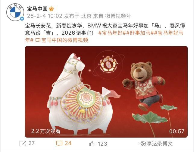 宝马则延续了其擅长的谐音梗与情感叙事。2月8日发布马年主题宣传片《宝马年好》,将《百骏图》中的马“唤醒”并以东南西北送出老少咸宜的拜年祝福,通过数字化唤醒《百骏图》,将品牌基因与“马到成功”的国民祈愿深度绑定。