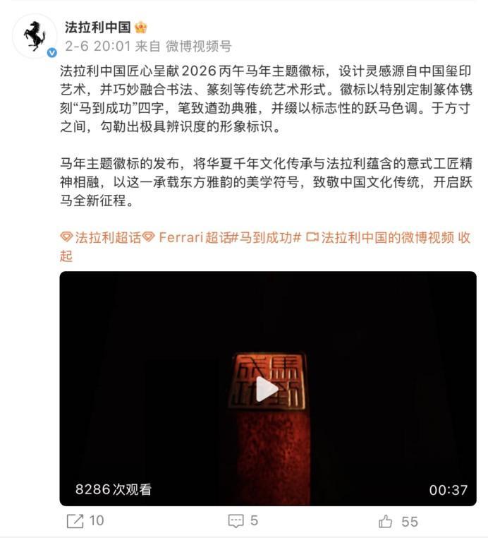 2月6日,法拉利揭幕马年专属主题徽标,以中国传统玺印艺术为灵感,特邀篆刻艺术家精心打造篆体“马到成功”字样,将跃马品牌标识与非遗篆刻技艺完美融合,同步推出典藏纪念品与经销商主题形象升级。
