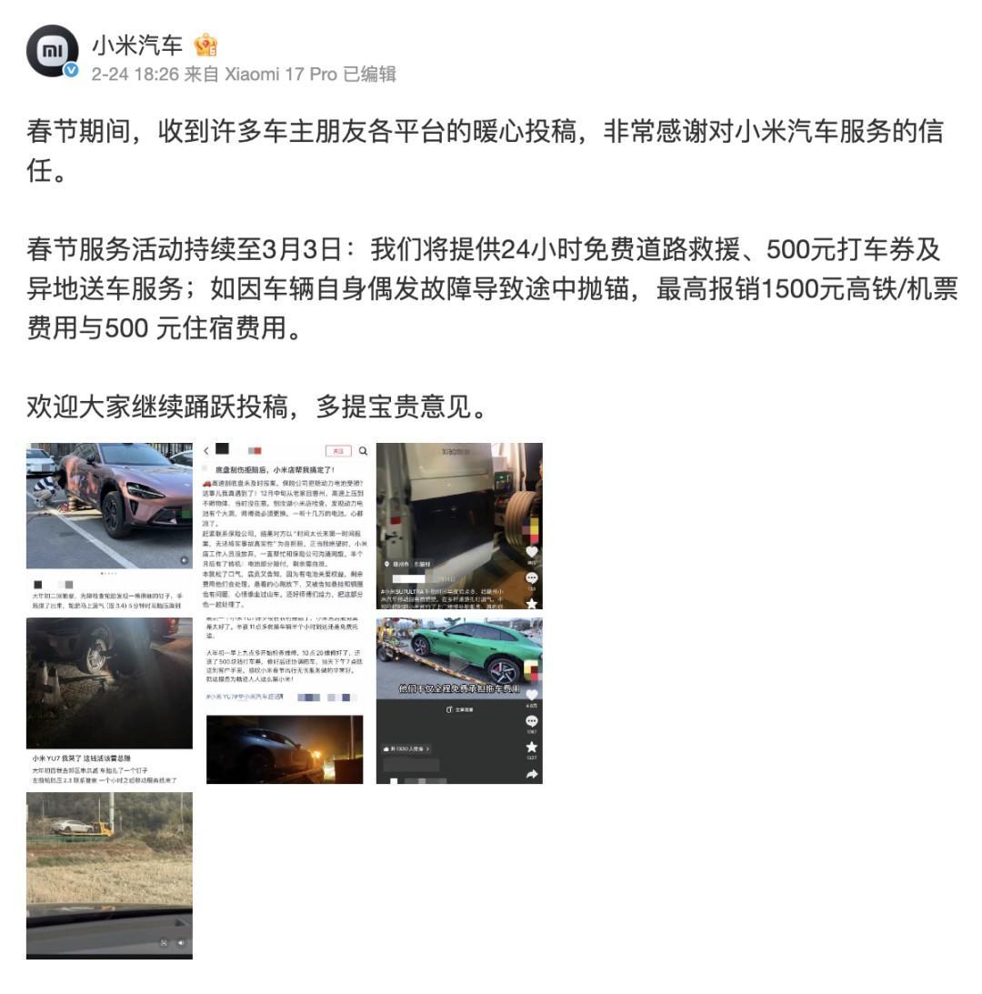 小米汽车推出“春节出行无忧”服务,除了不限次数、里程及救援方式的24小时免费道路救援外,还有“抛锚费用报销”,用户可申请含交通费用和住宿费用报销合计2000元的兜底额度,抚平“异地抛锚”的焦虑。