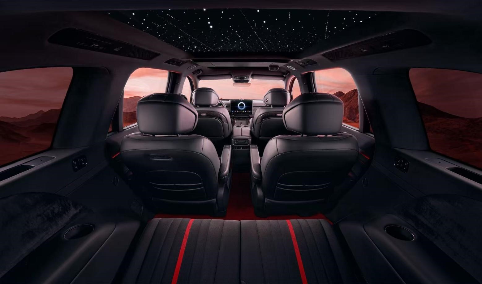 岚图泰山黑武士版纯黑车漆搭配全套熏黑套件营造暗藏锋芒的整体基调,天地星芒轮毂经10道核心工序加工,采用专属PVD黑亮镀膜工艺提升品质。该车内饰以大面积的“丹墨”为底,在座椅缝线、头枕等关键之处保留“丹砂”点红。