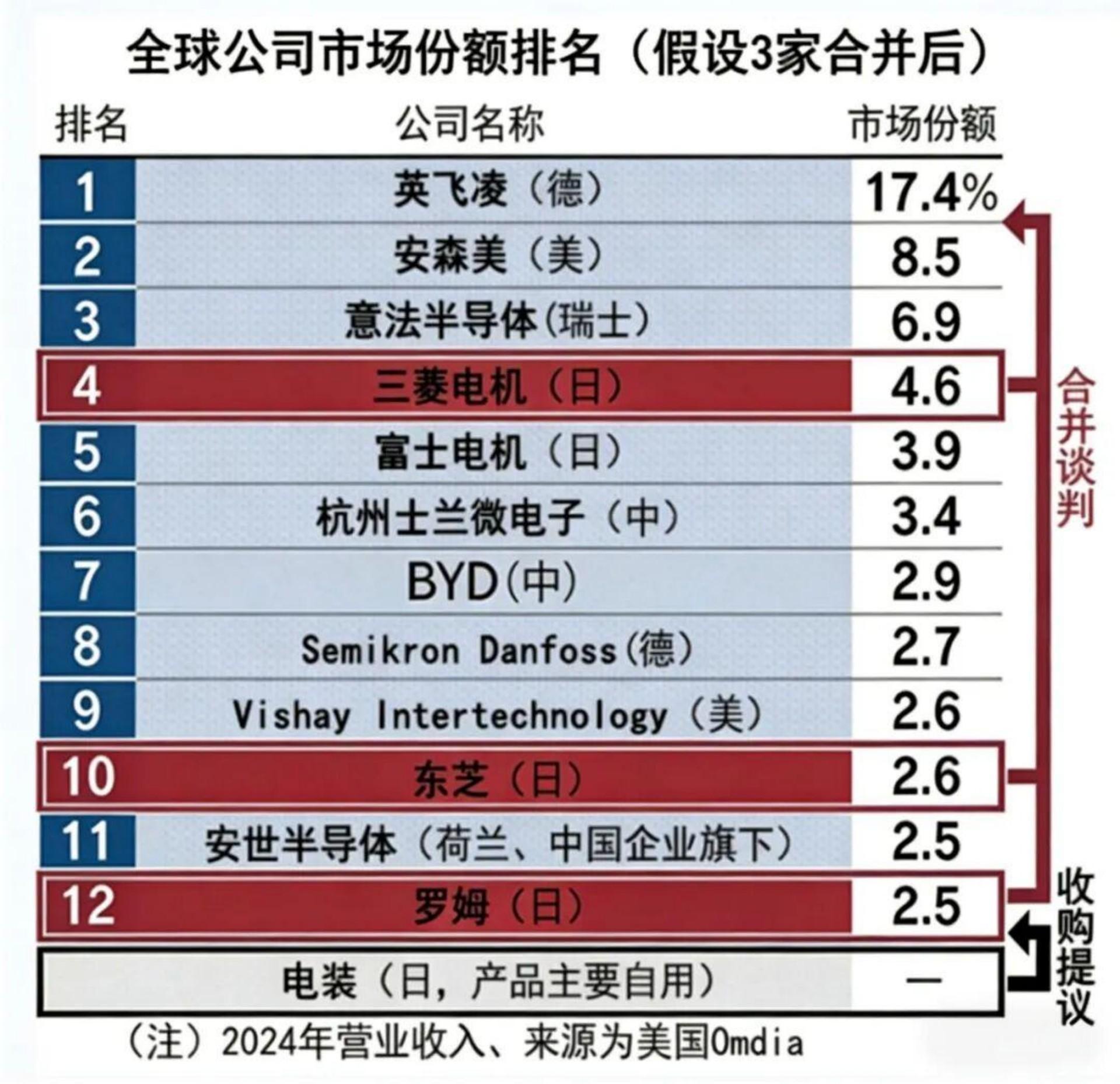 美国Omdia的数据显示,在2024年全球功率半导体市场中,德国英飞凌科技以17%的市场份额居首。三菱电机排在第4位,东芝和罗姆分别排在第10位和第12位。如果3家公司成功合并,其市场份额的单纯合计将超过美国安森美,跃居第2位。