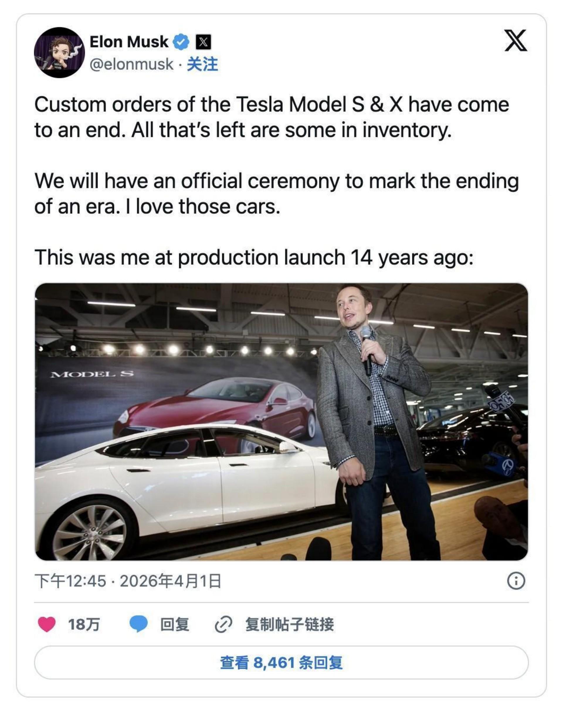 在推文中,马斯克还顺便附上了一张2012年Model S量产发布会的老照片,突显了这一决定的情感分量。