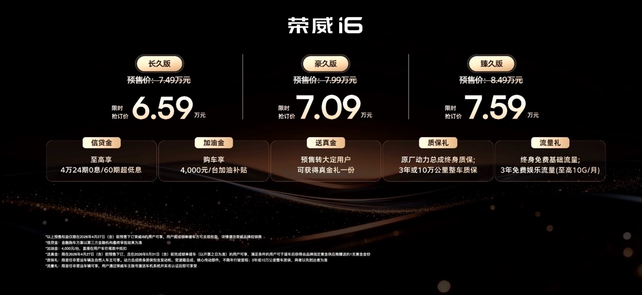 2026年4月13日,荣威i6正式开启预售,推出长久版、豪久版、臻久版三款车型,限时抢订价6.59万-7.59万元。购车可享至高4万元24期0息/ 60期超低息、4000元加油补贴,动力总成终身质保;5月底前锁单提车还赠足金金钞,以高诚意重塑国民家轿价值标杆。