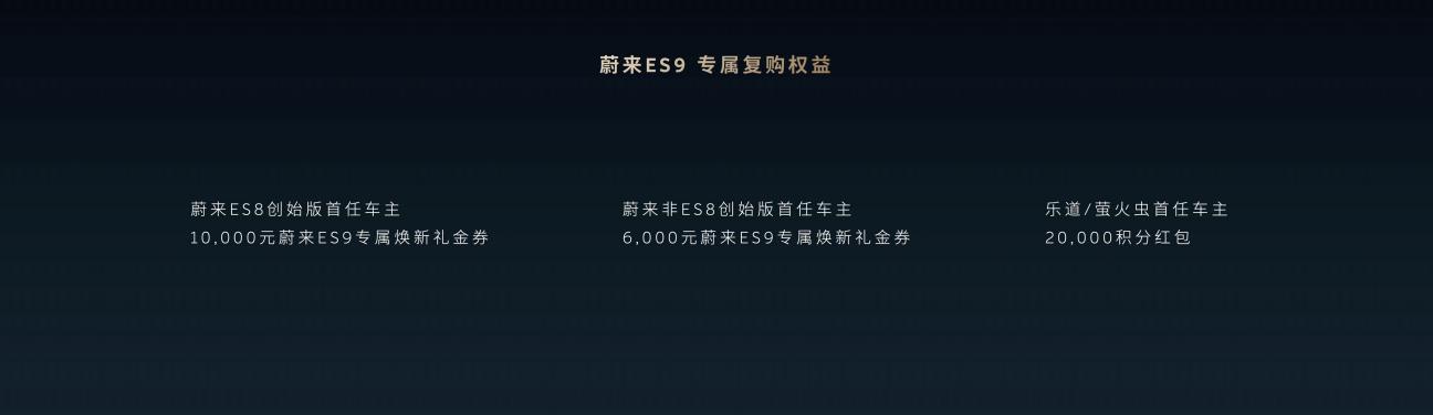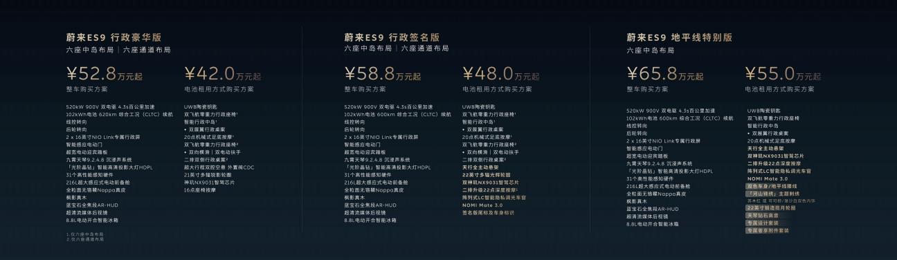 ES9 行政豪华版预售价52.8万元起,BaaS电池租用价42万元起;行政签名版 58.8万元起,BaaS价48万元起;地平线特别版65.8万元起,BaaS价55万元起。4月9日至正式上市前,预订可享5000元抵10000元购车款;老用户专享复购礼遇,ES8创始版首任车主获1万元焕新券,其他首任车主6000元,乐道、萤火虫首任车主赠2万复购积分。