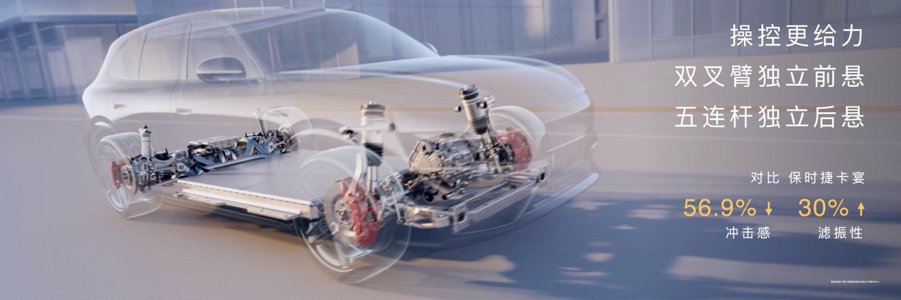 问界M6标配华为途灵平台,前双叉臂独立悬架,后五连杆独立悬架。闭式空气弹簧搭配连续可变阻尼减震器,可实现5挡80mm范围高度调节,阻尼调节频率30次/s。前四活塞固定式刹车卡钳,4×46mm活塞卡钳,百零刹停距离33.8m。