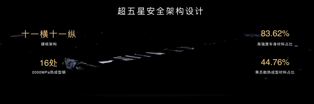 超五星安全架构设计,十一横十一纵硬核车身,高强度车身材料占比83.62%,乘员舱热成型材料占比44.76%,全车16处采用2000MPa热成型钢材料。全新一体化加强门环设计,门框强度提升15%,创新双C环车身结构,扭转刚度提升133%。