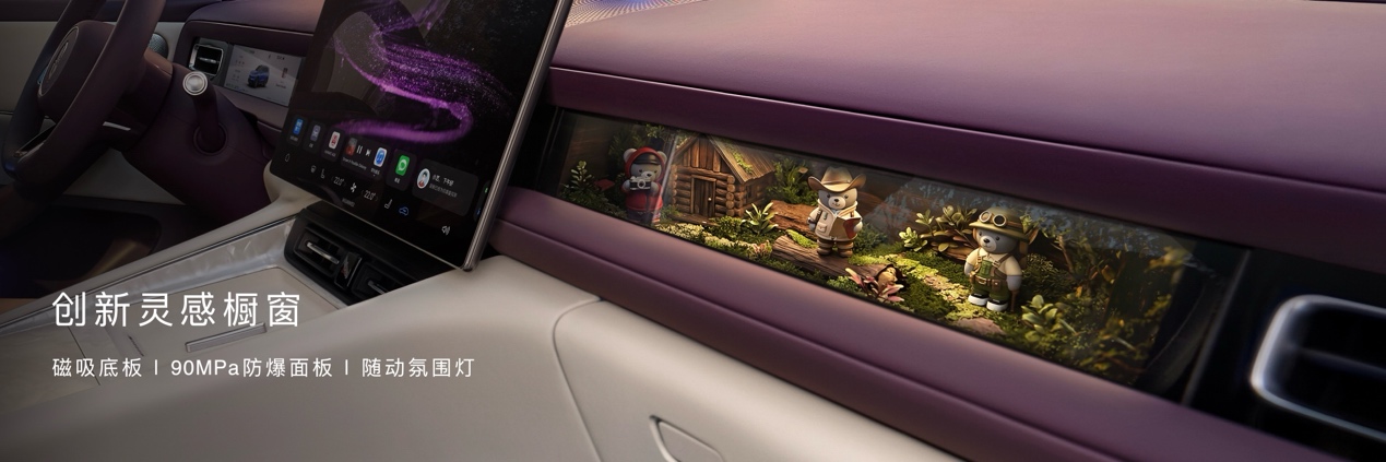 创新灵感橱窗采用磁吸设计,拥有随动氛围灯,支持陈列官方磁吸公仔、迷你模型等。配合车机壁纸随心更换,“你的座舱你做主”。灵感橱窗经过安全验证,外部防爆钢化玻璃面板强度90MPa,碰撞后依旧保持完整。灵感橱窗支持更换墨彩相册、律动香氛等多种配件,呈现“百变副驾”。