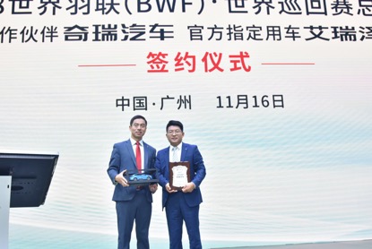 11月16日,第十六届广州国际车展上,奇瑞汽车与“2018世界羽联•世界巡回赛总决赛”赛事组委会举行了官方合作签约仪式。