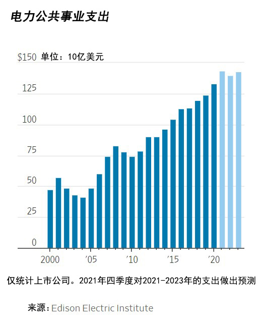 行业组织爱迪生电气研究所(Edison Electric Institute)预计,在2022年和2023年,电力公司每年将投资约1400亿美元。这是该组织2000年开始追踪电力行业支出以来的最高水平。