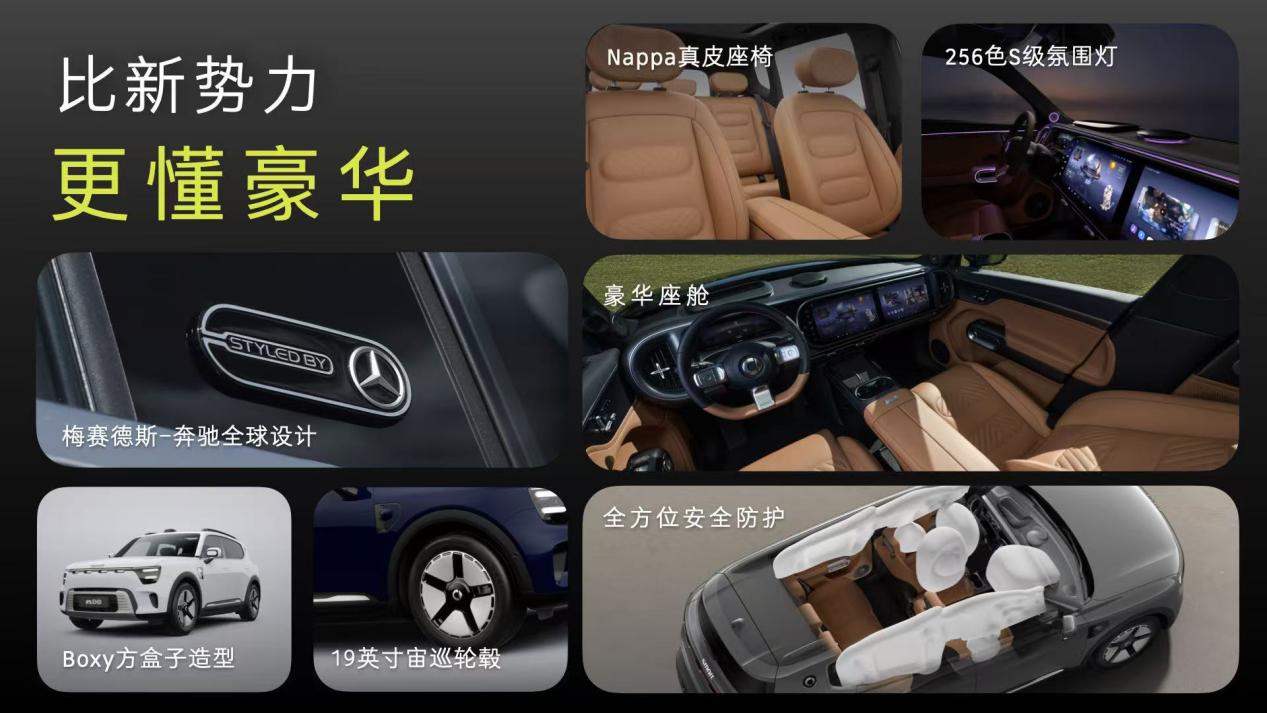 设计与空间表现上,新车由梅赛德斯-奔驰全球设计团队主导,延续品牌标志性的Boxy方盒子造型,搭配赛博光影贯穿式LED大灯与超红光立体悬浮LED尾灯,新增苍岩灰、星漩蓝等5种外观颜色及浅蜜棕、曜石黑2种内饰风格,满足用户个性化需求。