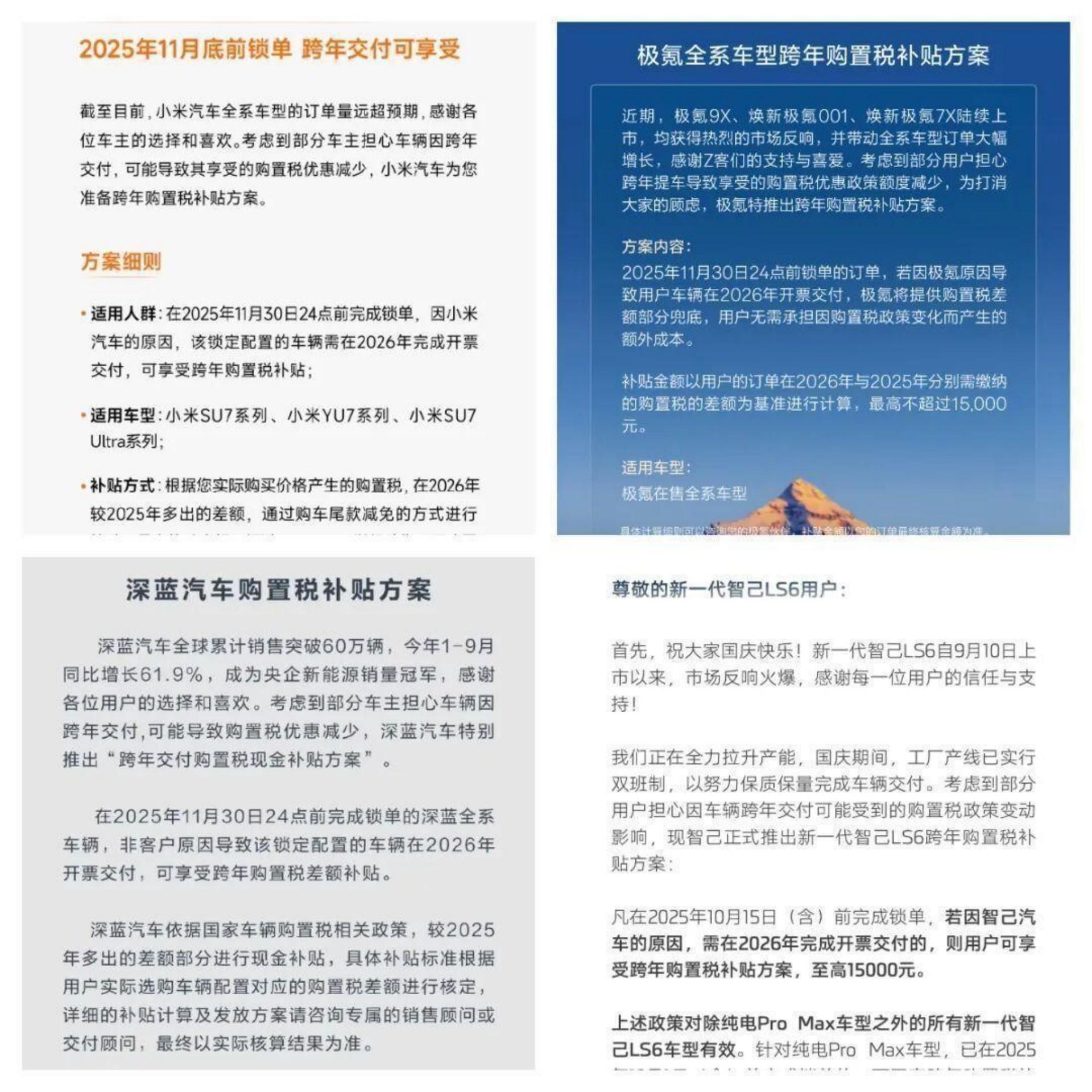 比如极氪汽车的方案:2025年11月30日24点前锁单的订单,若因极氪原因导致用户车辆在2026年开票交付,极氪将提供购置税差额部分兜底。