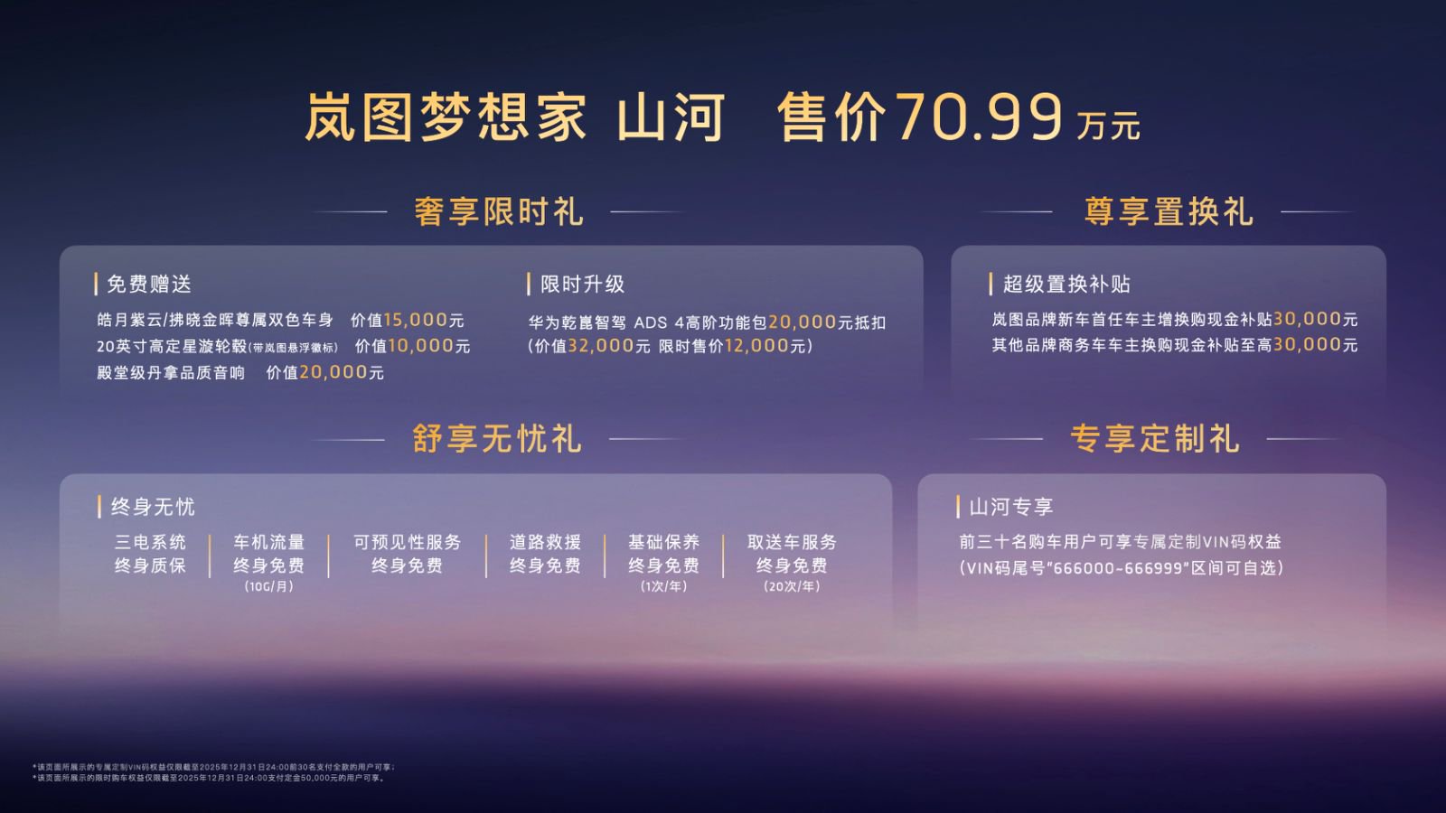 11月21日,广州车展盛大启幕,“新时代旗舰四座MPV”岚图梦想家山河正式上市,售价70.99万元。同步推出山河专属四重礼,包含皓月紫云/拂晓金辉尊属双色车身、20英寸高定星漩轮毂(带岚图悬浮徽标),及殿堂级丹拿品质音响;华为乾崑智驾ADS 4高阶功能包现金抵扣;超级置换补贴;专属定制VIN码权益;三电系统终身质保、车机流量终身免费、道路救援终身免费等权益。