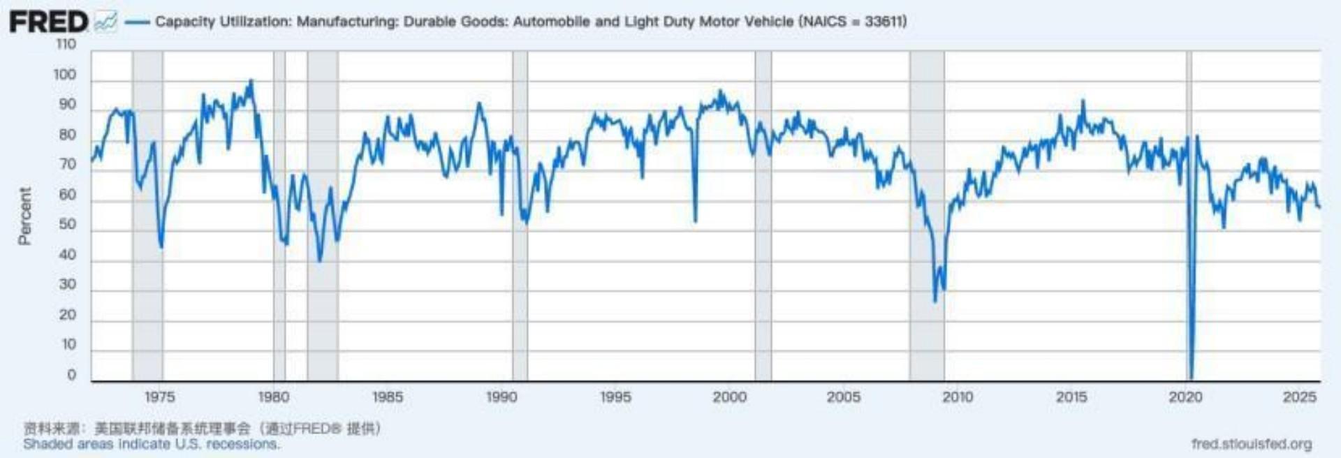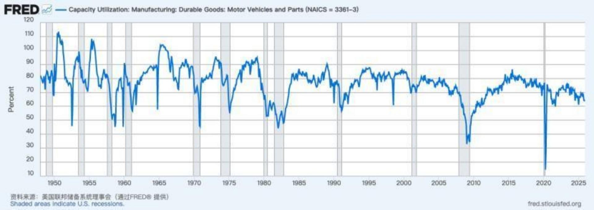 美国联邦储备系统理事会发布的统计数据显示,2025年美国汽车及零部件产能利用率始终在60%—70%区间震荡,季度末受产销旺季影响略有回升,但始终未突破70%。