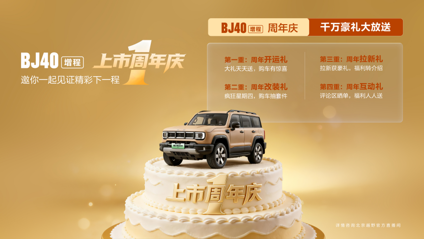4月7日,北京越野于北京越涯庄举办BJ40增程上市周年庆主题直播,通过6小时直播发布车型上市一周年核心成绩,并推出四重购车豪礼及叠加置换、金融政策,进一步加码用户权益。