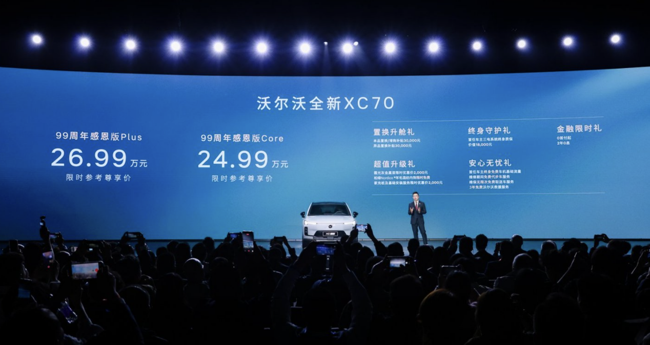 同期推出全新XC 70 99周年感恩版,Core版限时24.99万元、Plus版26.99万元,定位25万级豪华插混SUV。新车基于SMA超混架构,纯电续航116km,综合续航超1200km,搭载硼钢笼式车身、7气囊、23个智能感知硬件及CLEANZONE®座舱,提供置换补贴、终身质保等多重权益。