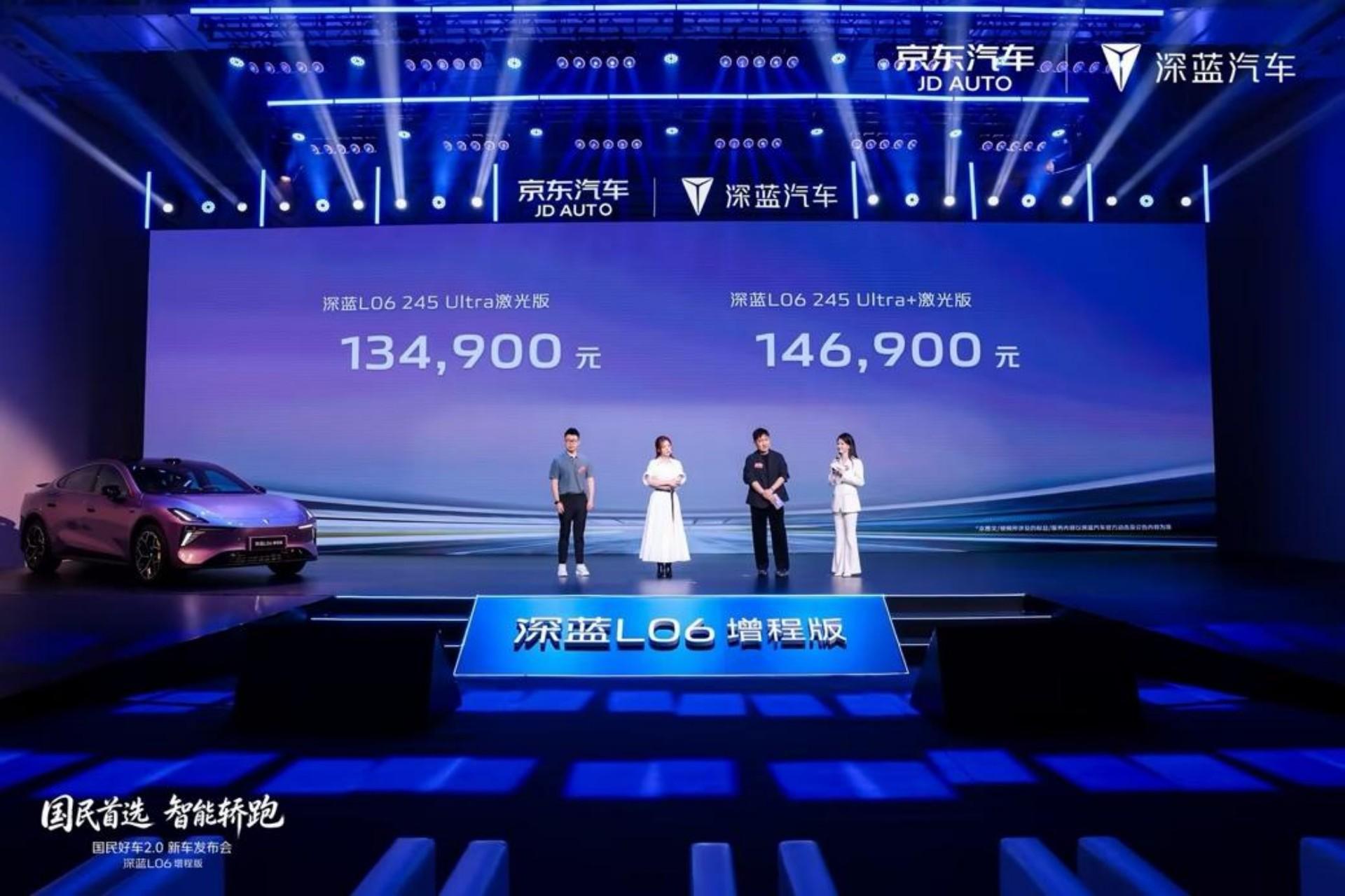 2026年4月23日,深蓝汽车与京东汽车联合发布深蓝L06增程版,推出245Ultra激光版、245Ultra+激光版两款车型,官方指导价13.49万元、14.69万元,限时权益后到手价分别为127115元、138555元,由京东汽车独家销售。