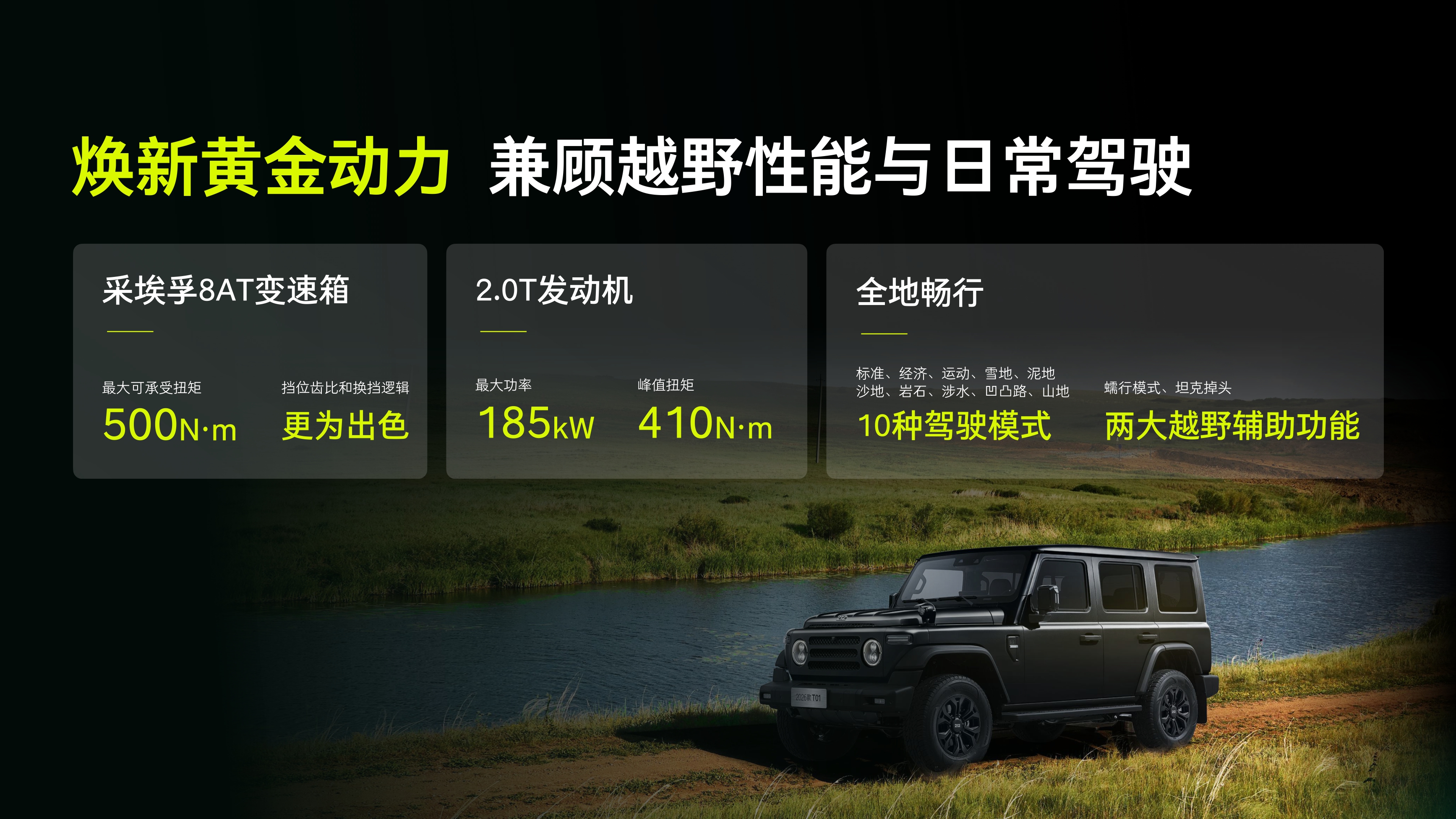 探境者01拥有254mm离地间隙与850mm涉水深度,标配采埃孚8AT变速箱及博格华纳大分动器,动力方面搭载2.3T柴油发动机,采用高压多孔燃油喷射技术,可实现高效燃烧表现,最大功率达140kW,峰值扭矩高达500N·m。